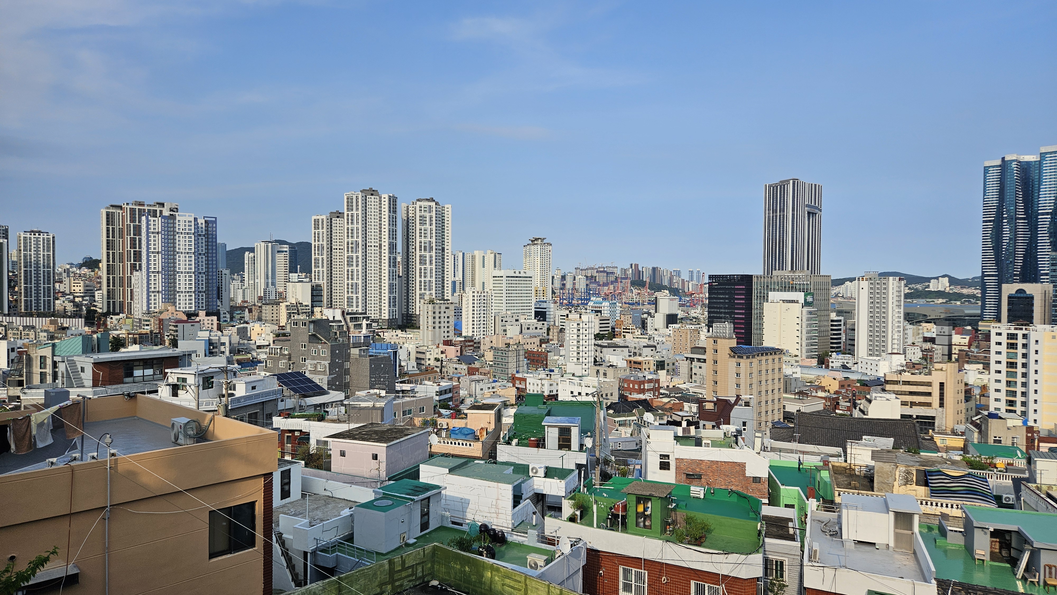 경사진 동네라 김민부 전망대 앞에 앞집 옥상 태양광 패널이 있습니다.