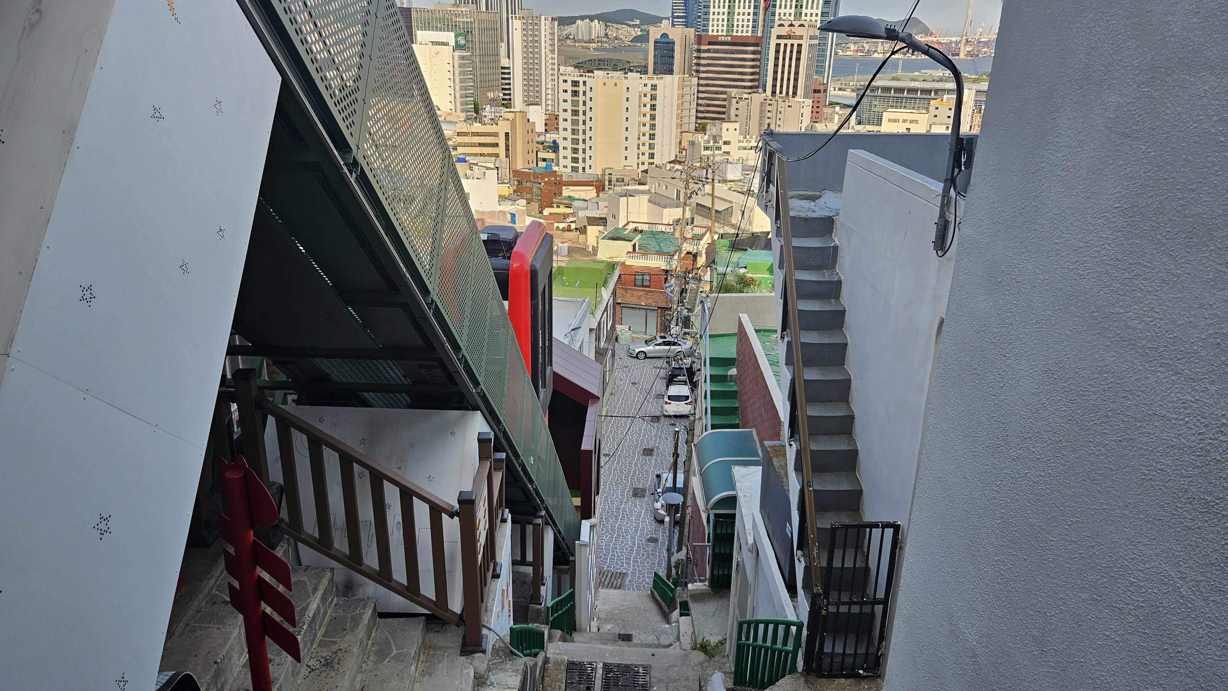 이런 좁고 가파른 초량동 골목을 초량 이바구길이라고 하며, 이바구길의 가장 중심이라 할 수 있는 168 계단과 모노레일 옆에 김민부 전망대가 있습니다.