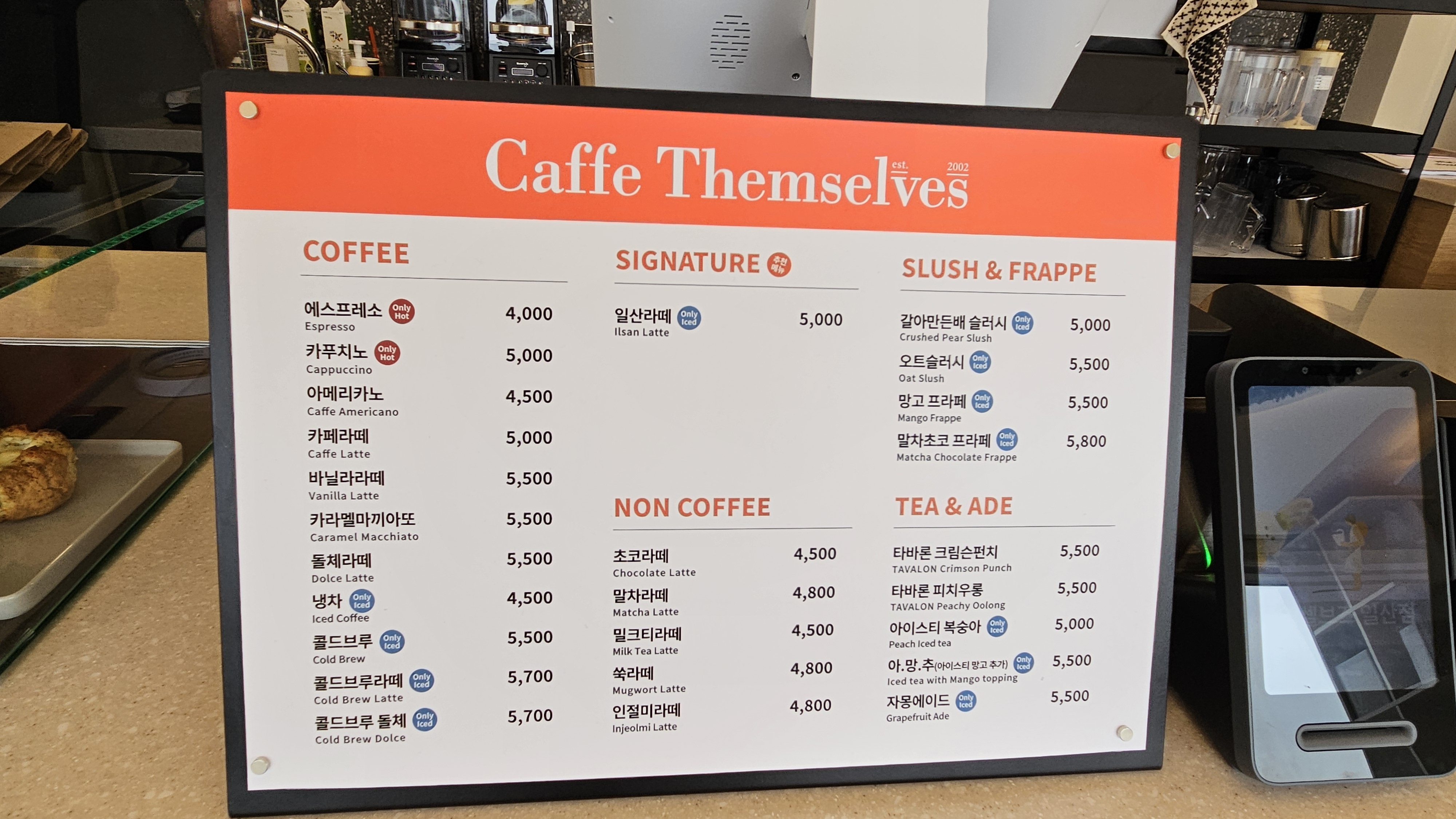 아메리카노 4,500원, 카페라떼 5,000원 등