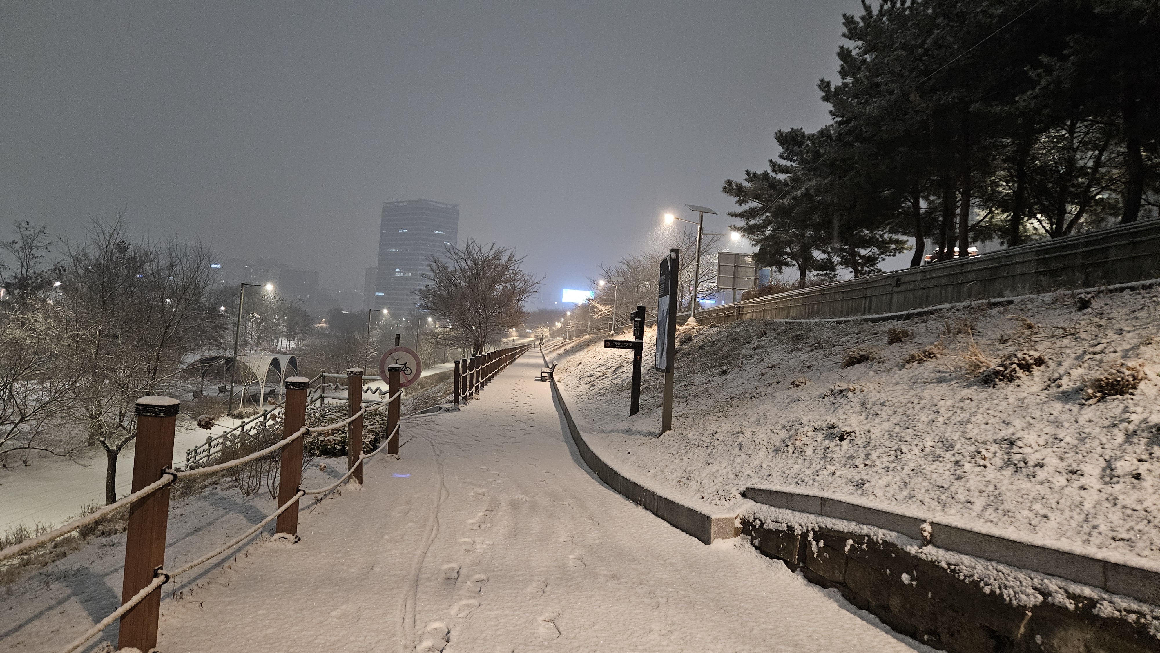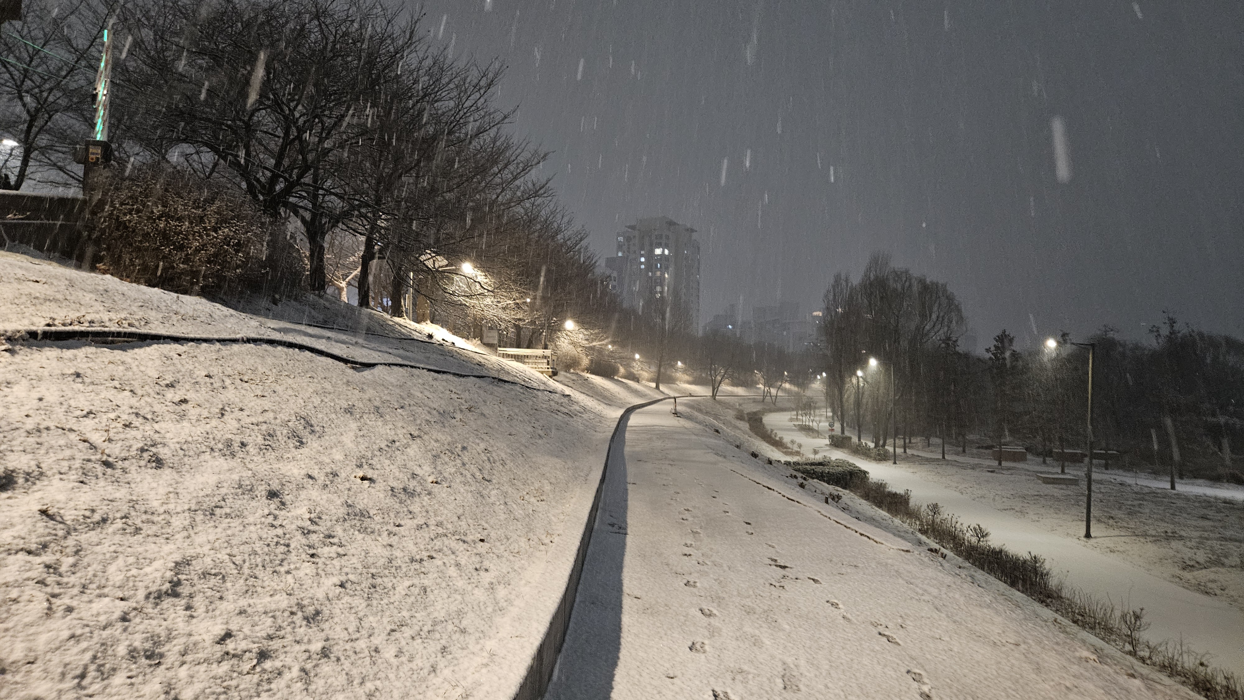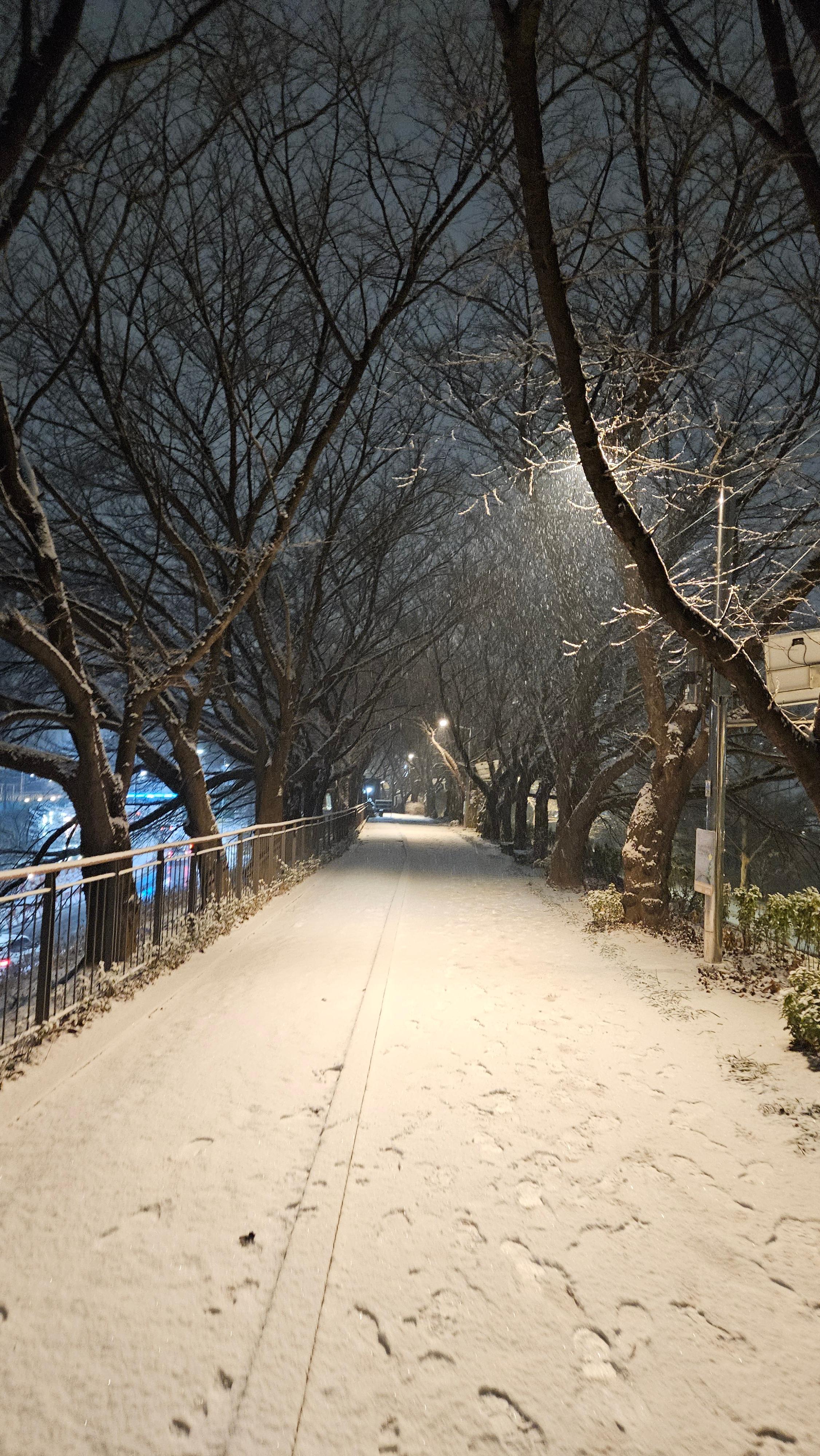 퇴근 후 저녁을 먹고 있으려니 함박눈이 내리길래 모처럼 눈을 구경하고 싶어 안영천을 산책했습니다.