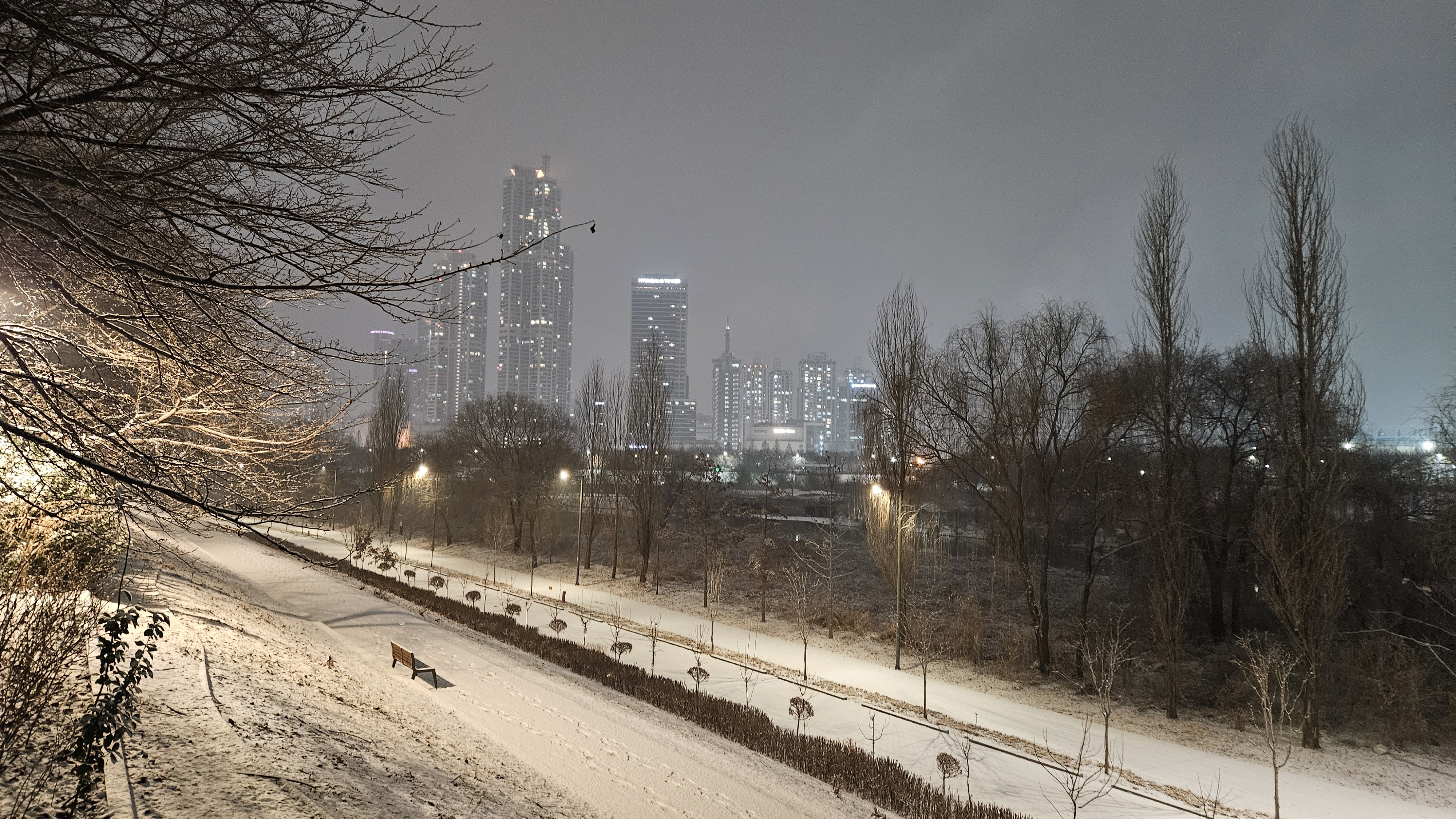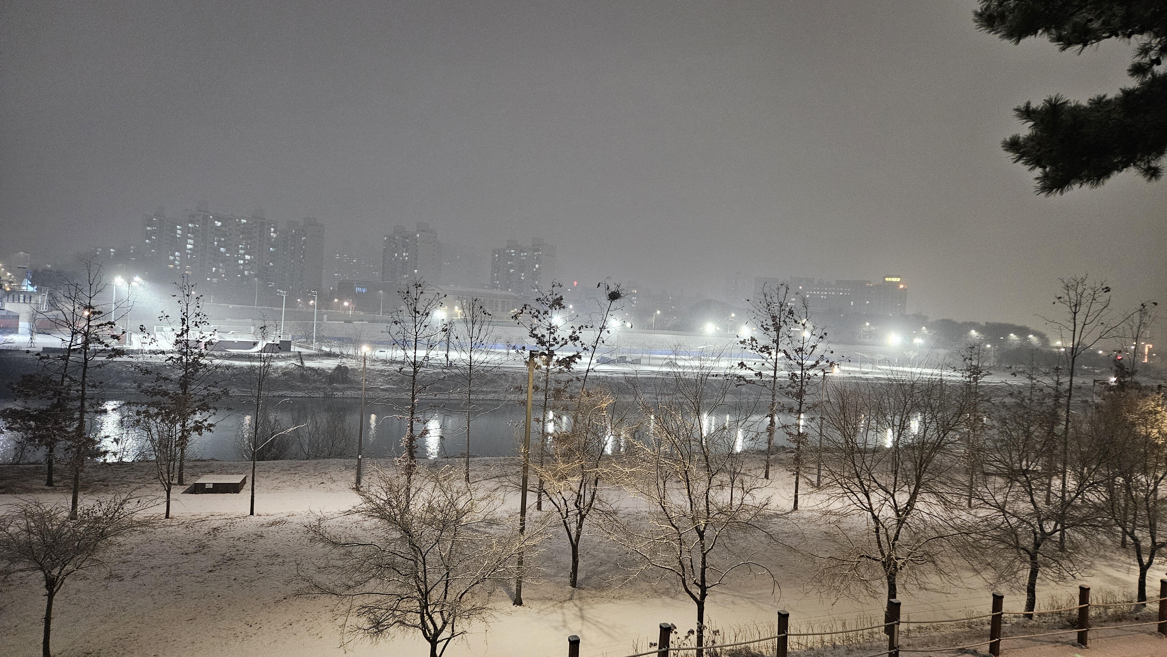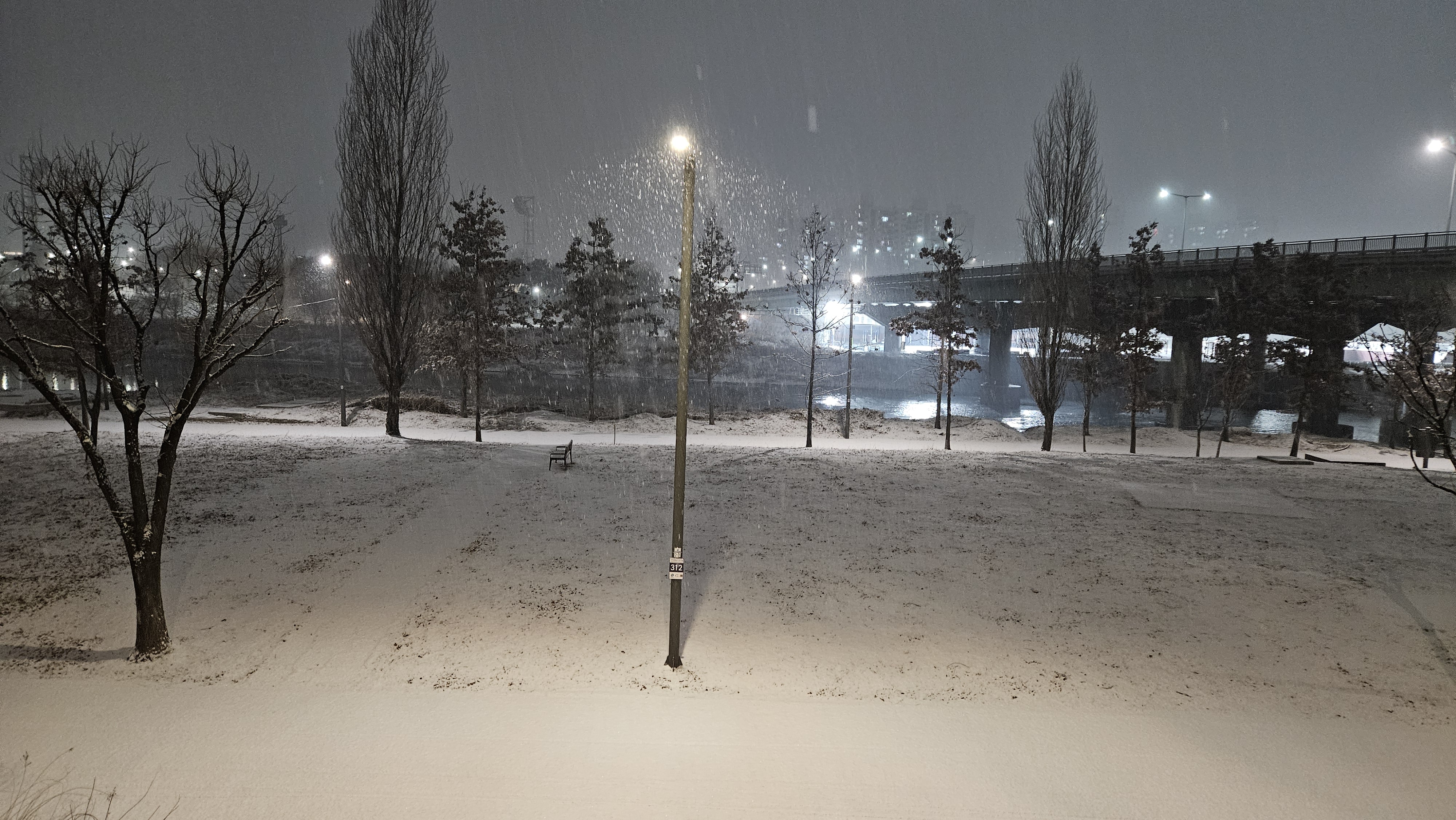 퇴근 후 저녁을 먹고 있으려니 함박눈이 내리길래 모처럼 눈을 구경하고 싶어 안영천을 산책했습니다.