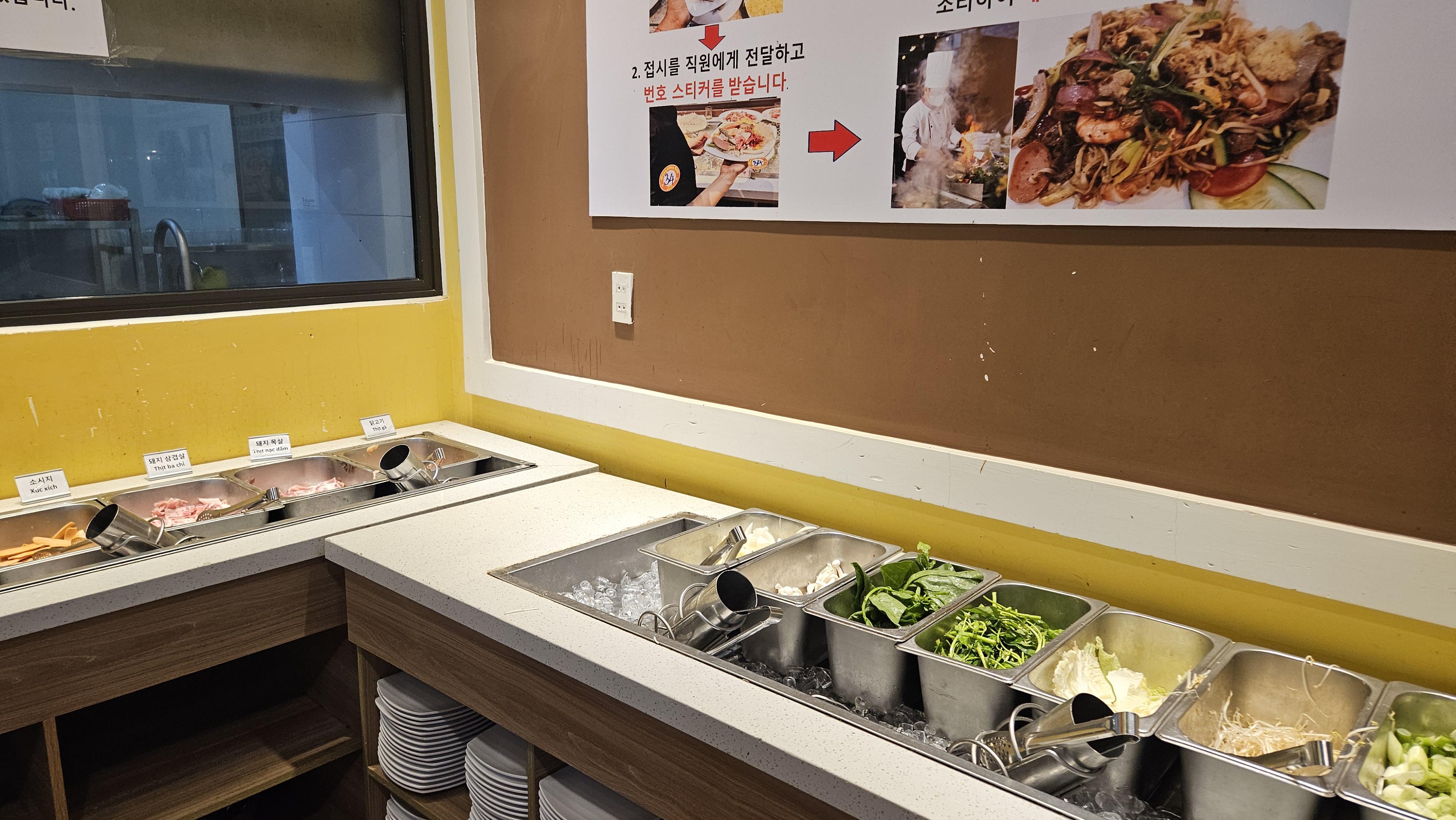 고기와 야채, 면 등 원하는 식재료를 담아 전달하면 커다란 철판으로 즉석에서 볶아주는 레스토랑이고, 이와는 별도로 샐러드바를 갖추고 있어 뷔페식당으로 운영하고 있는 곳인데요.