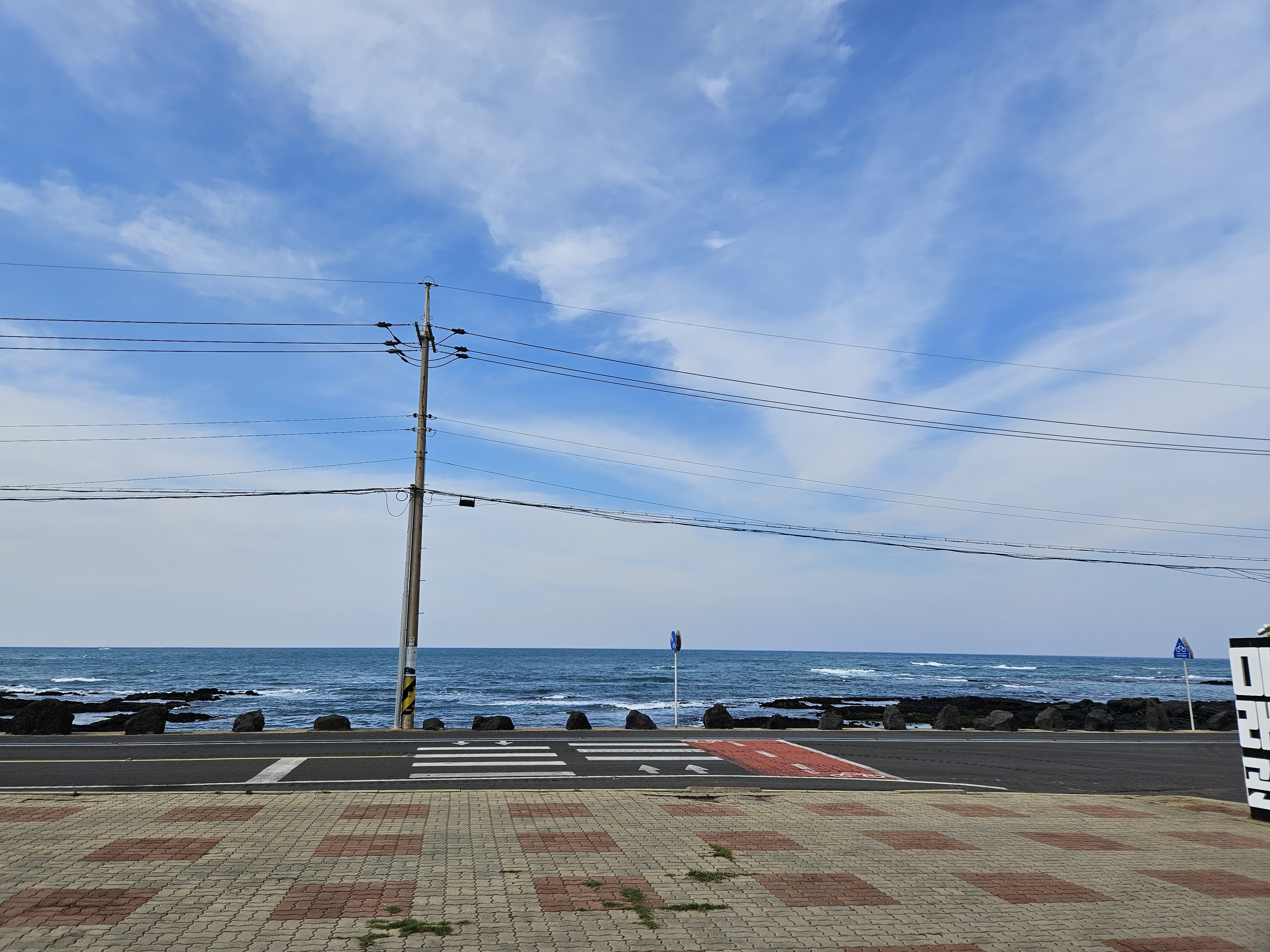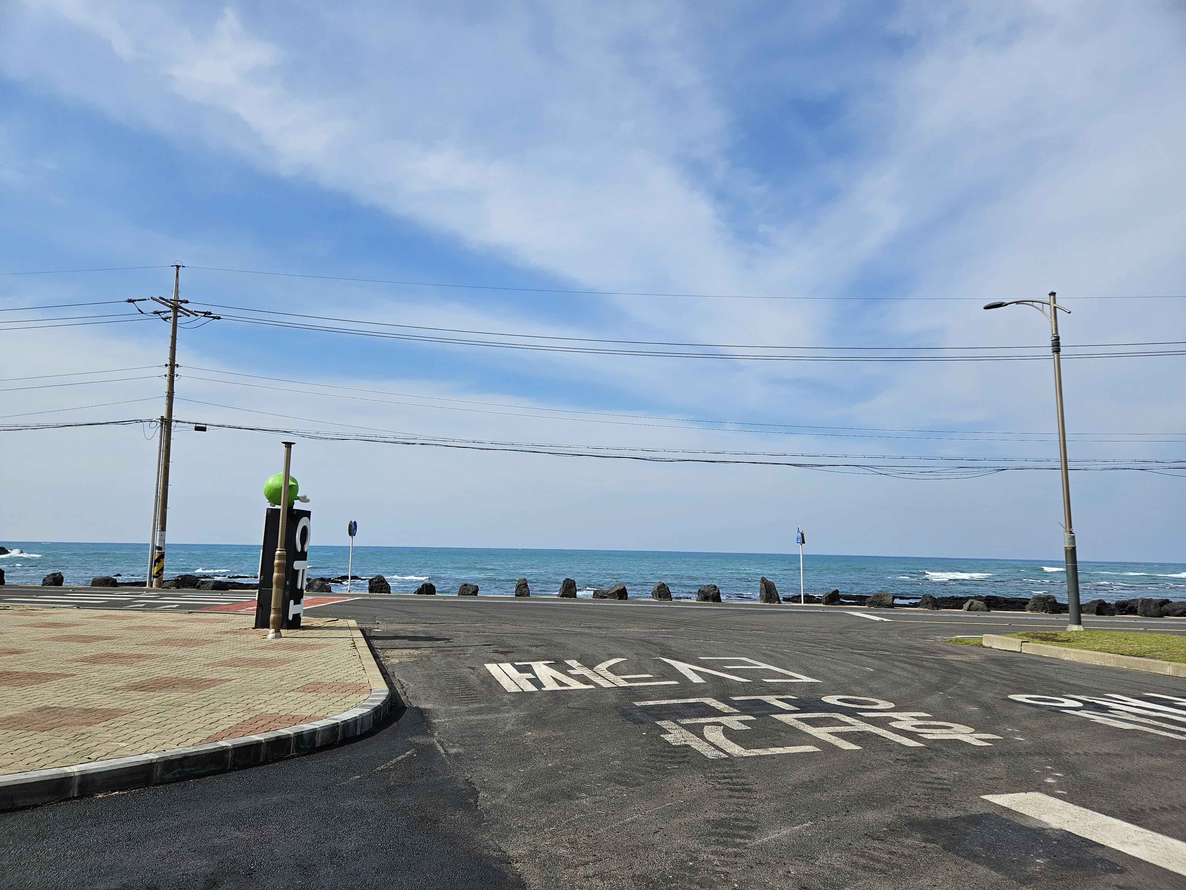 제주에너지공사 cfi에너지미래관 앞은 해맞이해안로가 지나가고 그 앞은 푸른 제주도 바다가 펼쳐져 있습니다.
