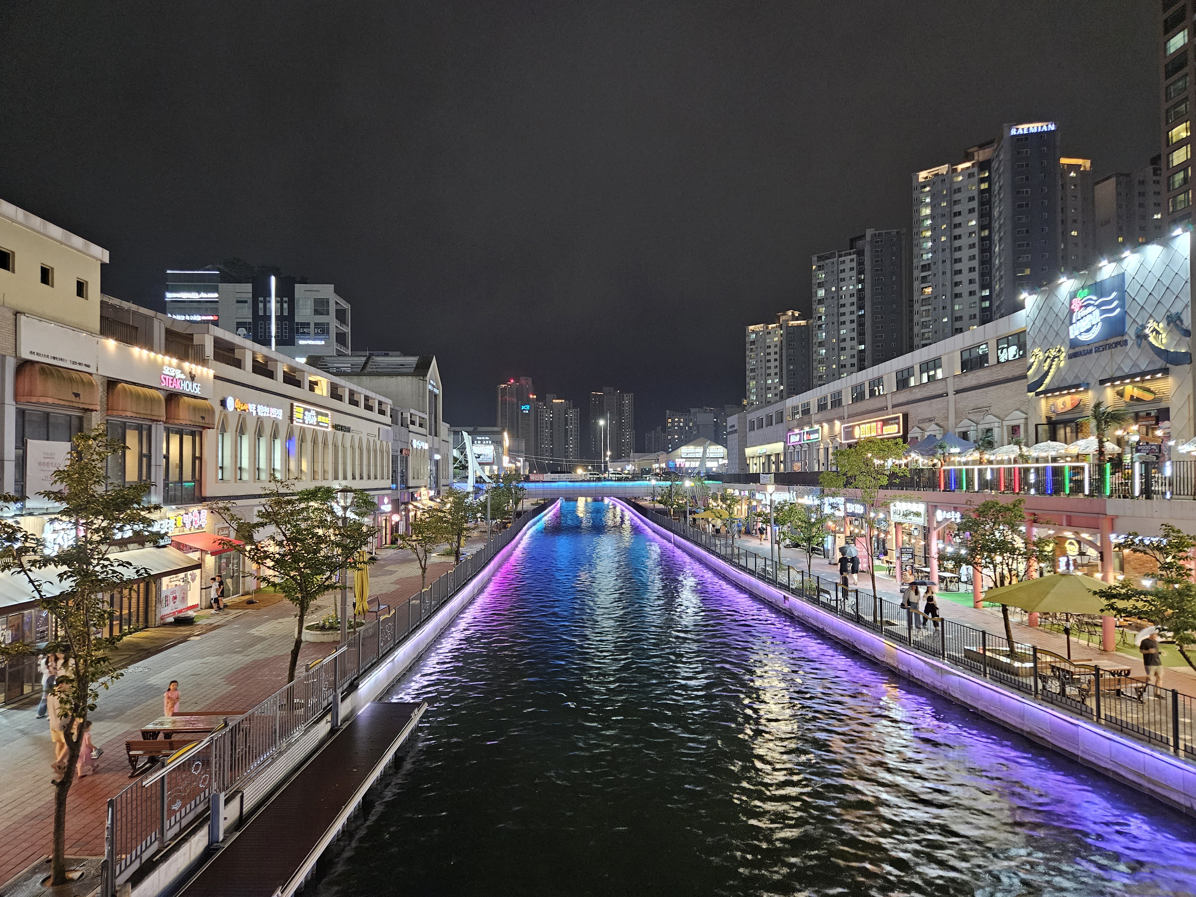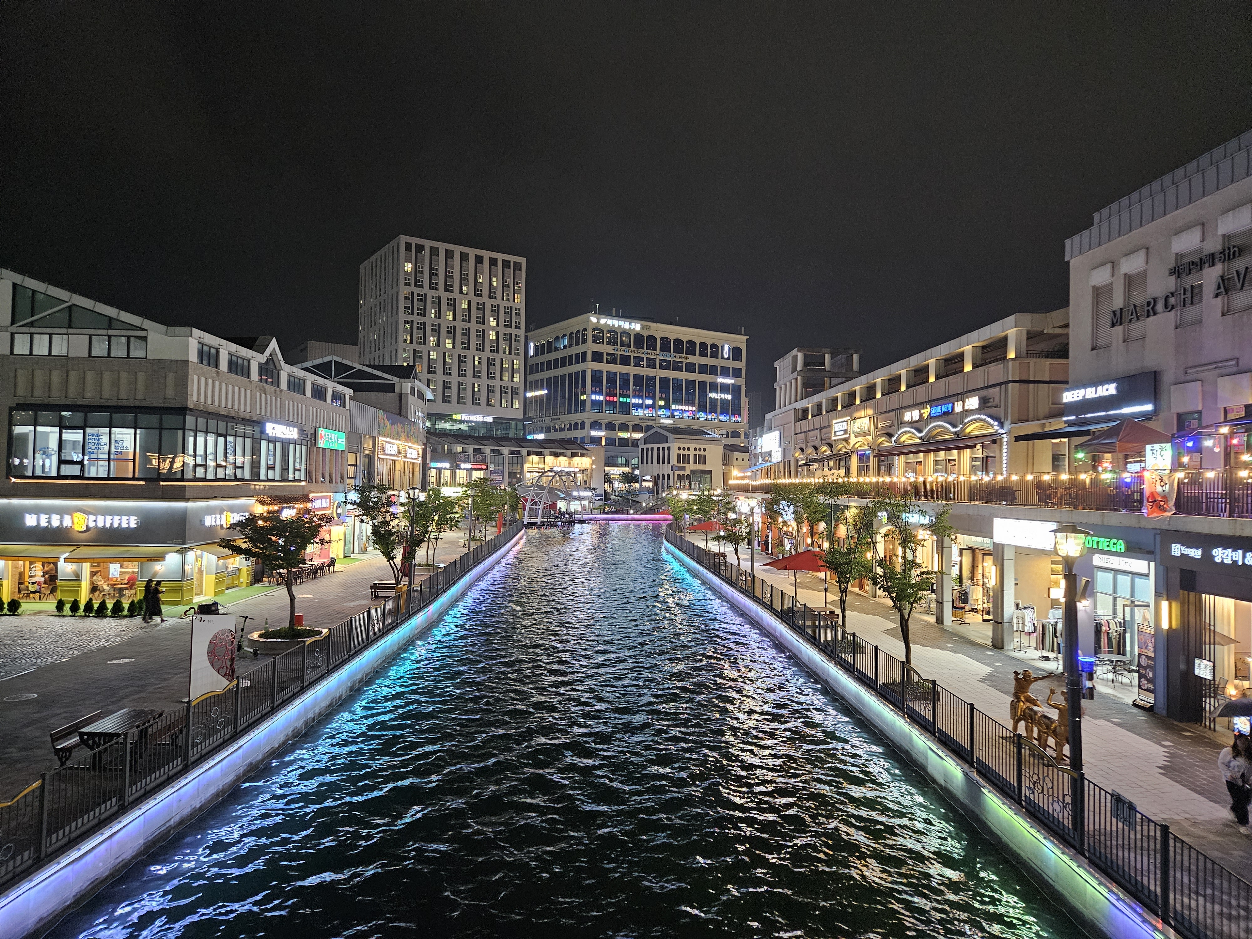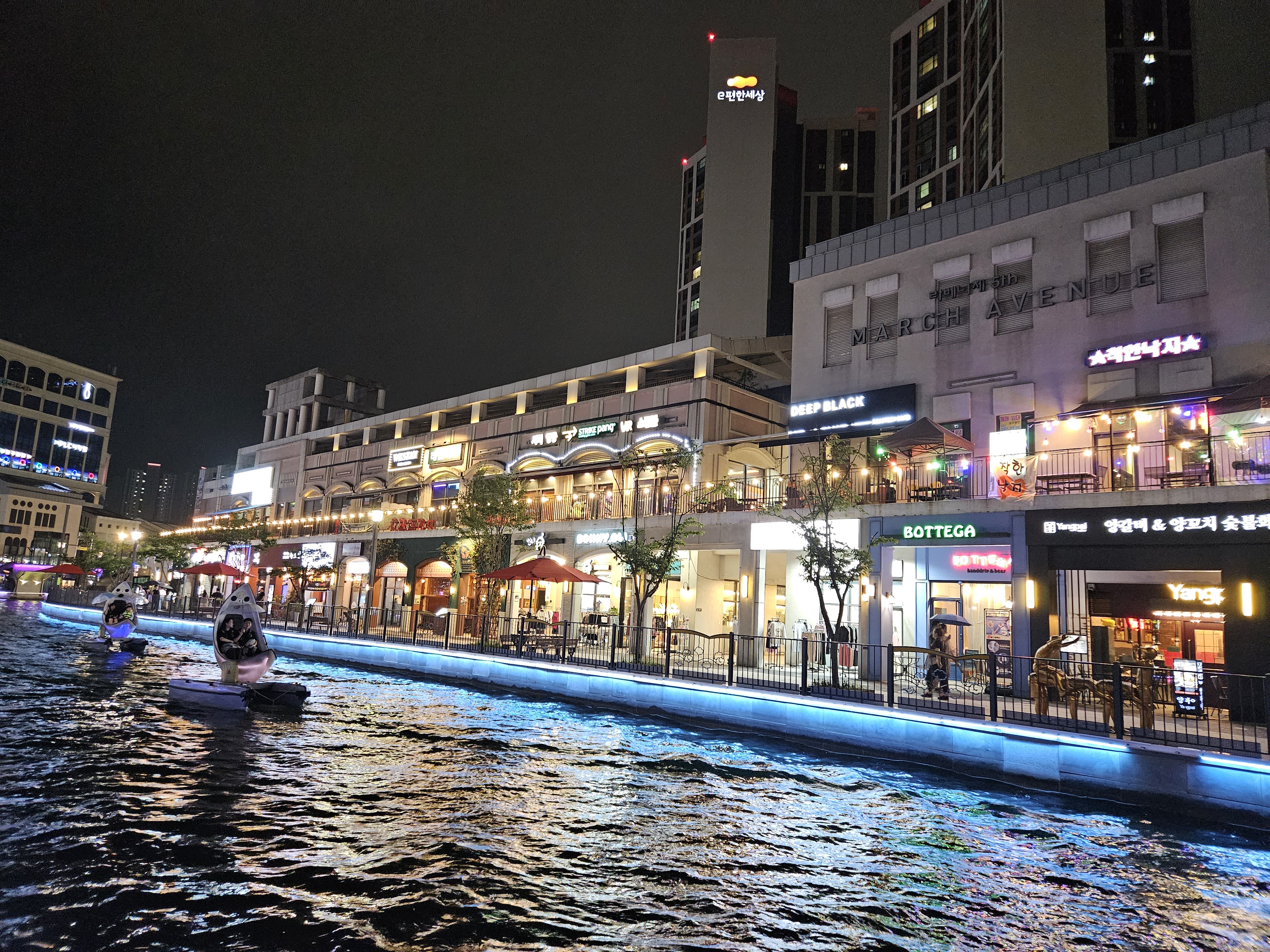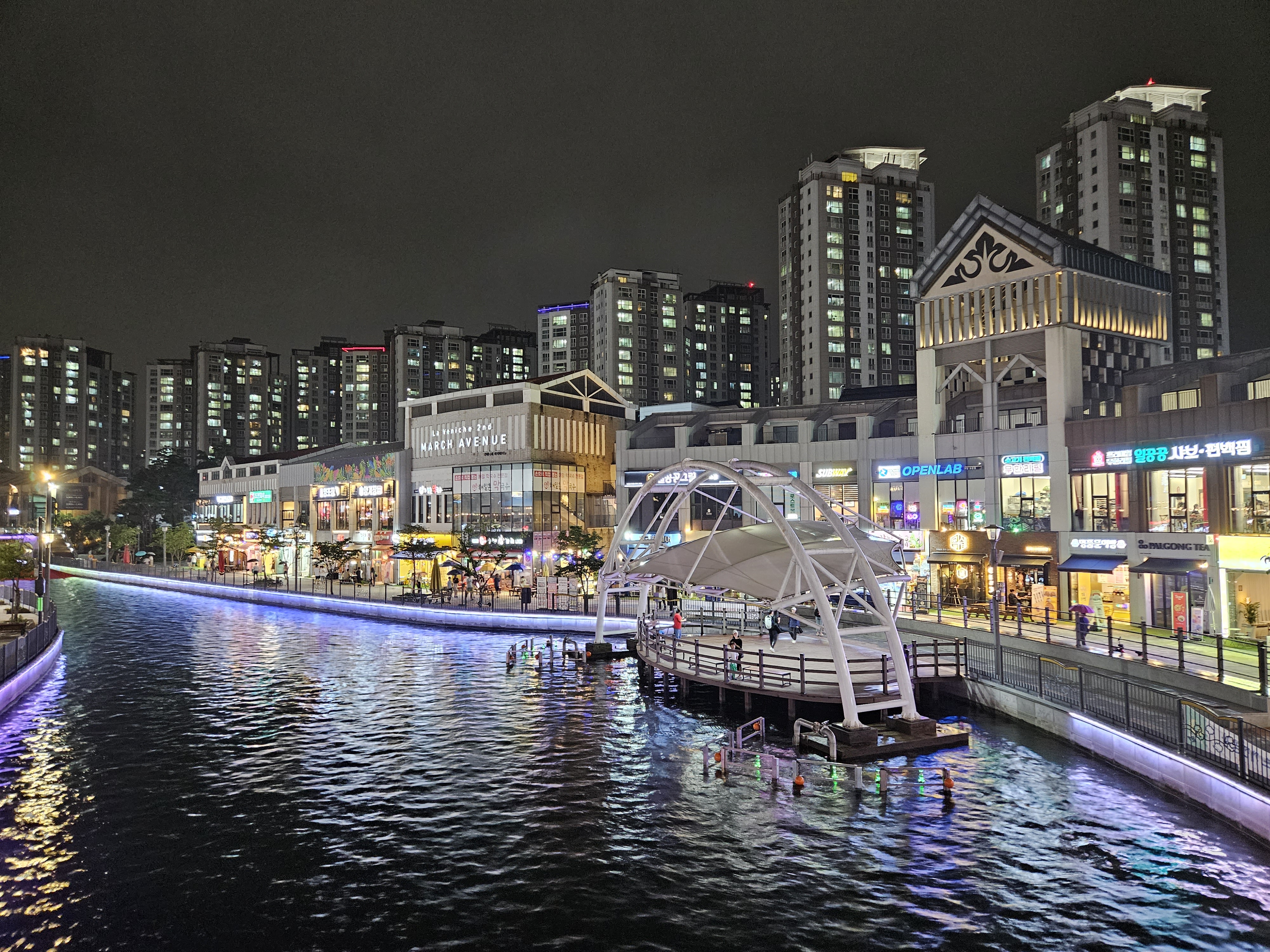 수변산책길인 금빛수로와 라베니체 상가가 어우러진 야경이 매우 이국적인 곳이죠.
