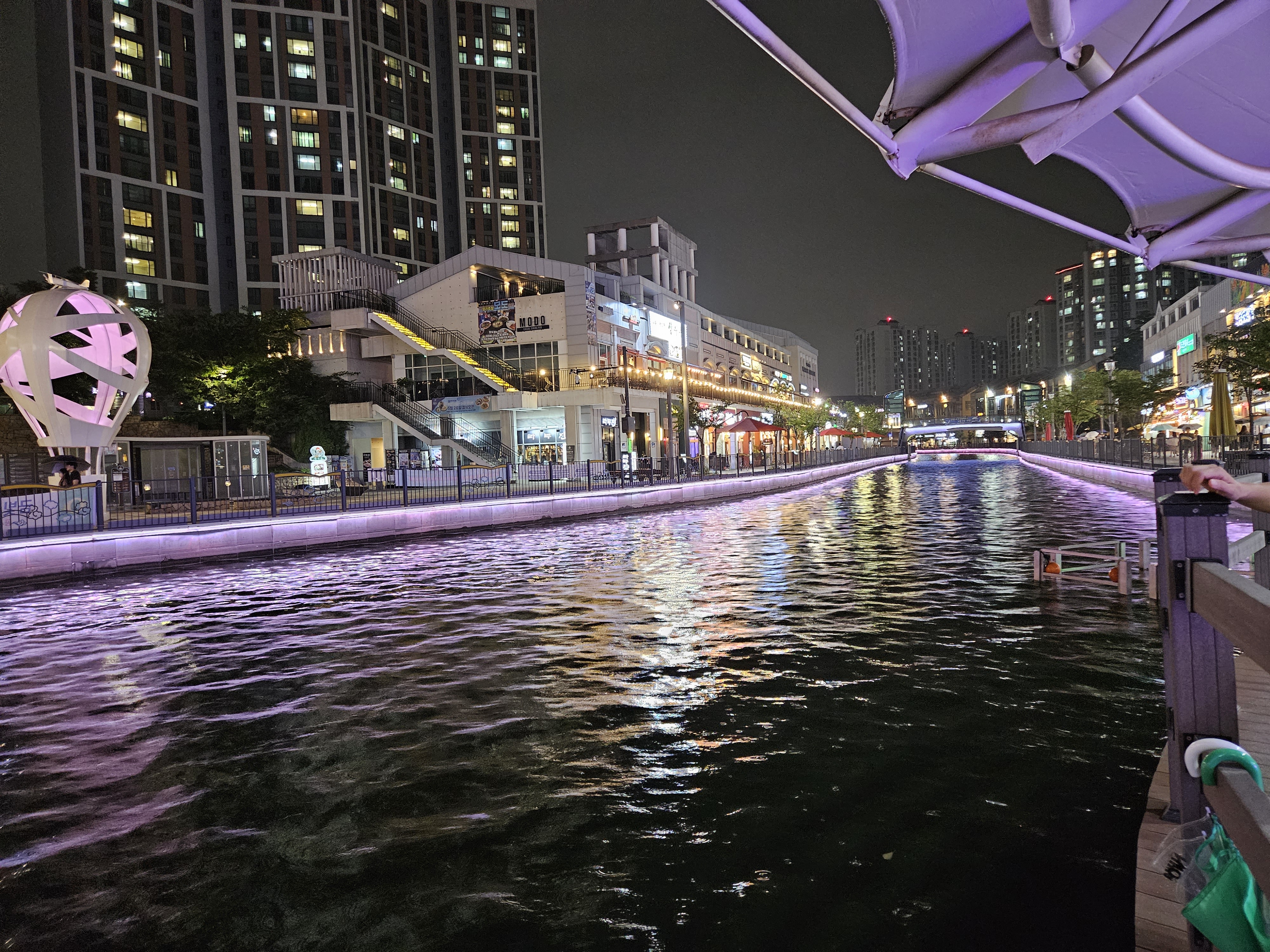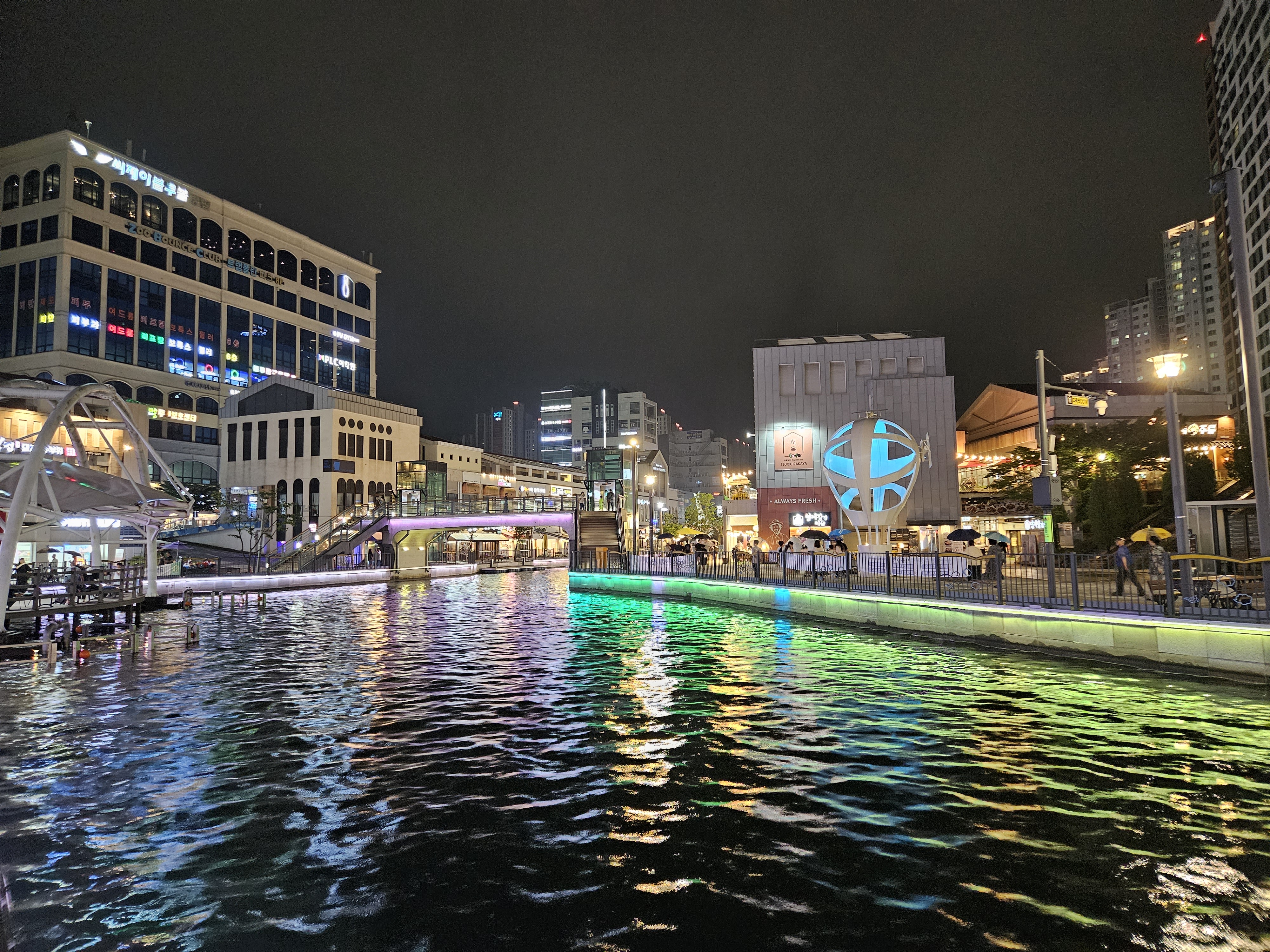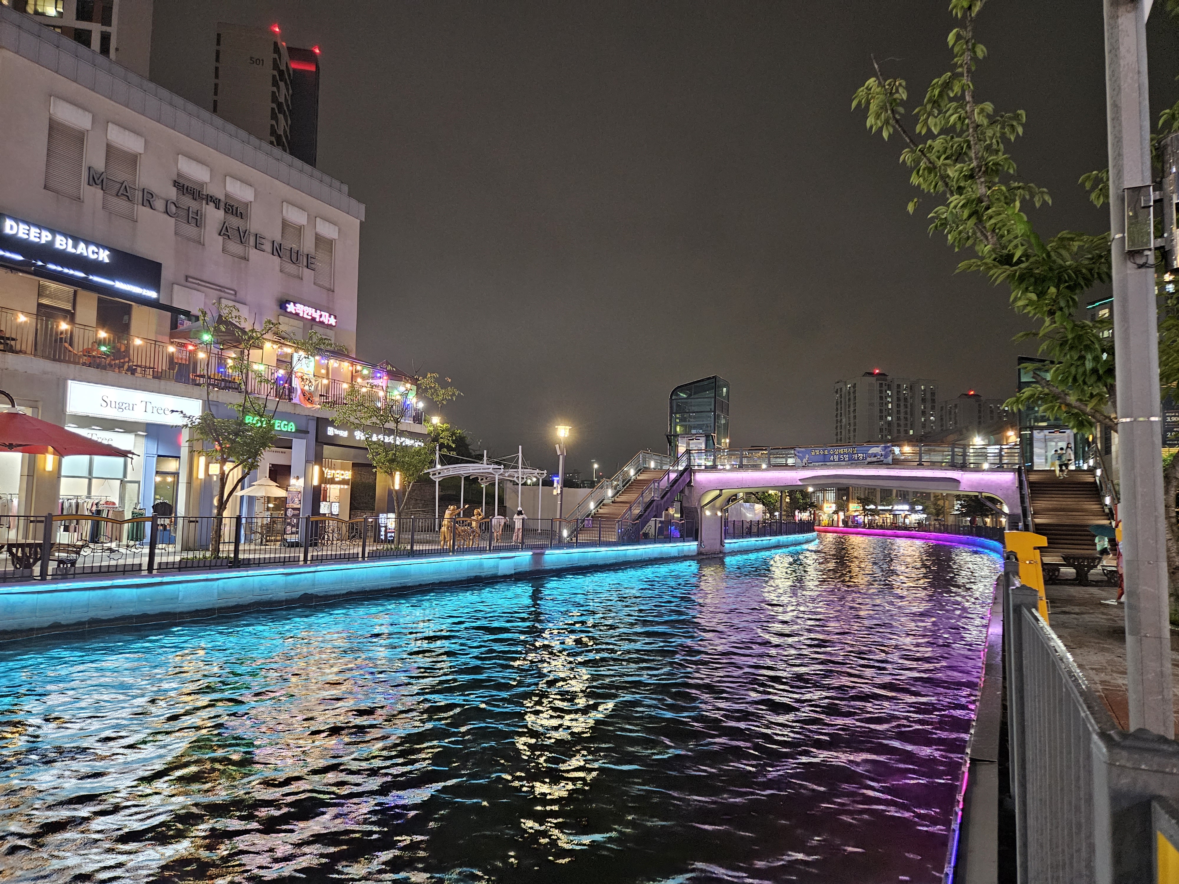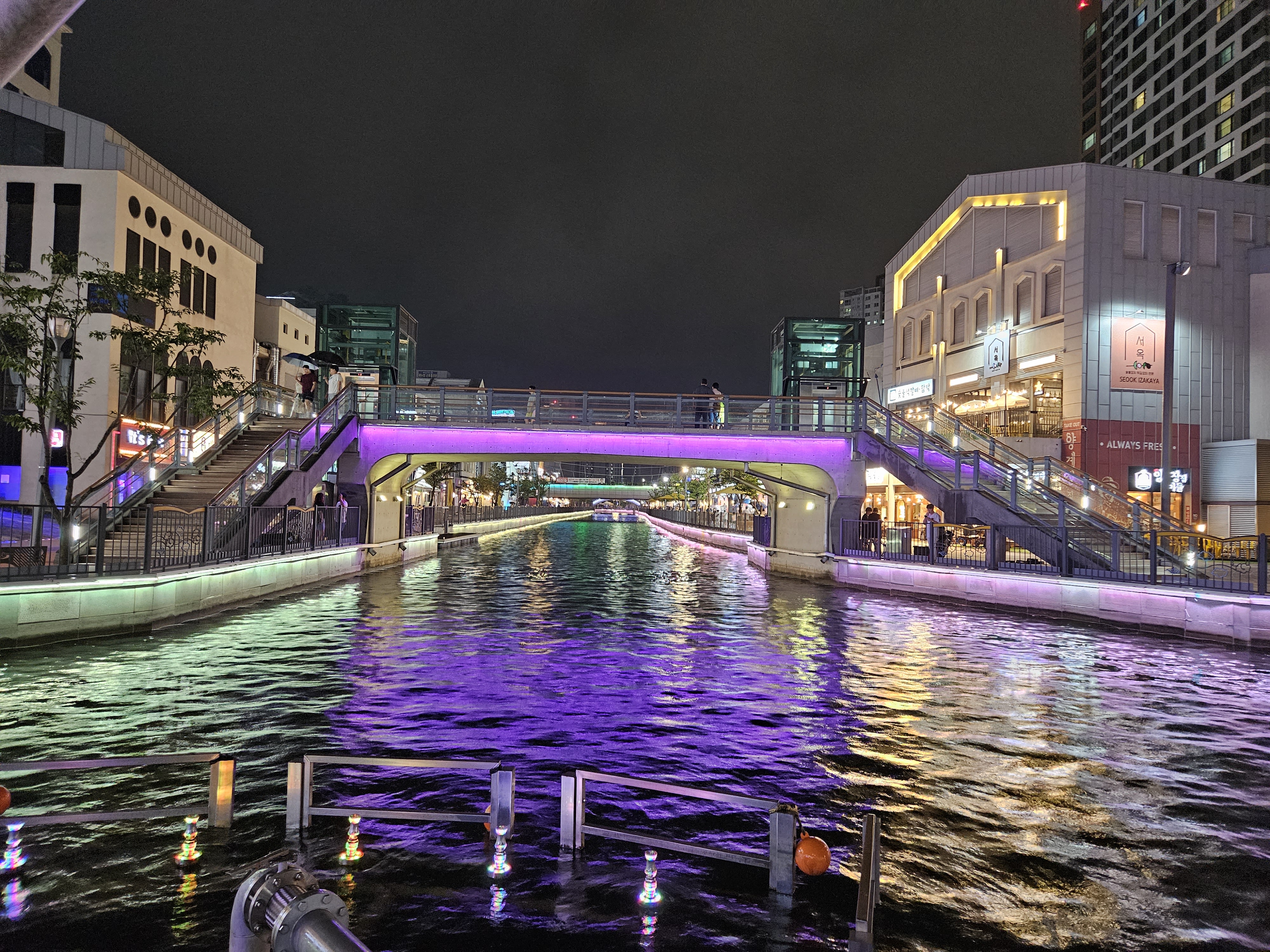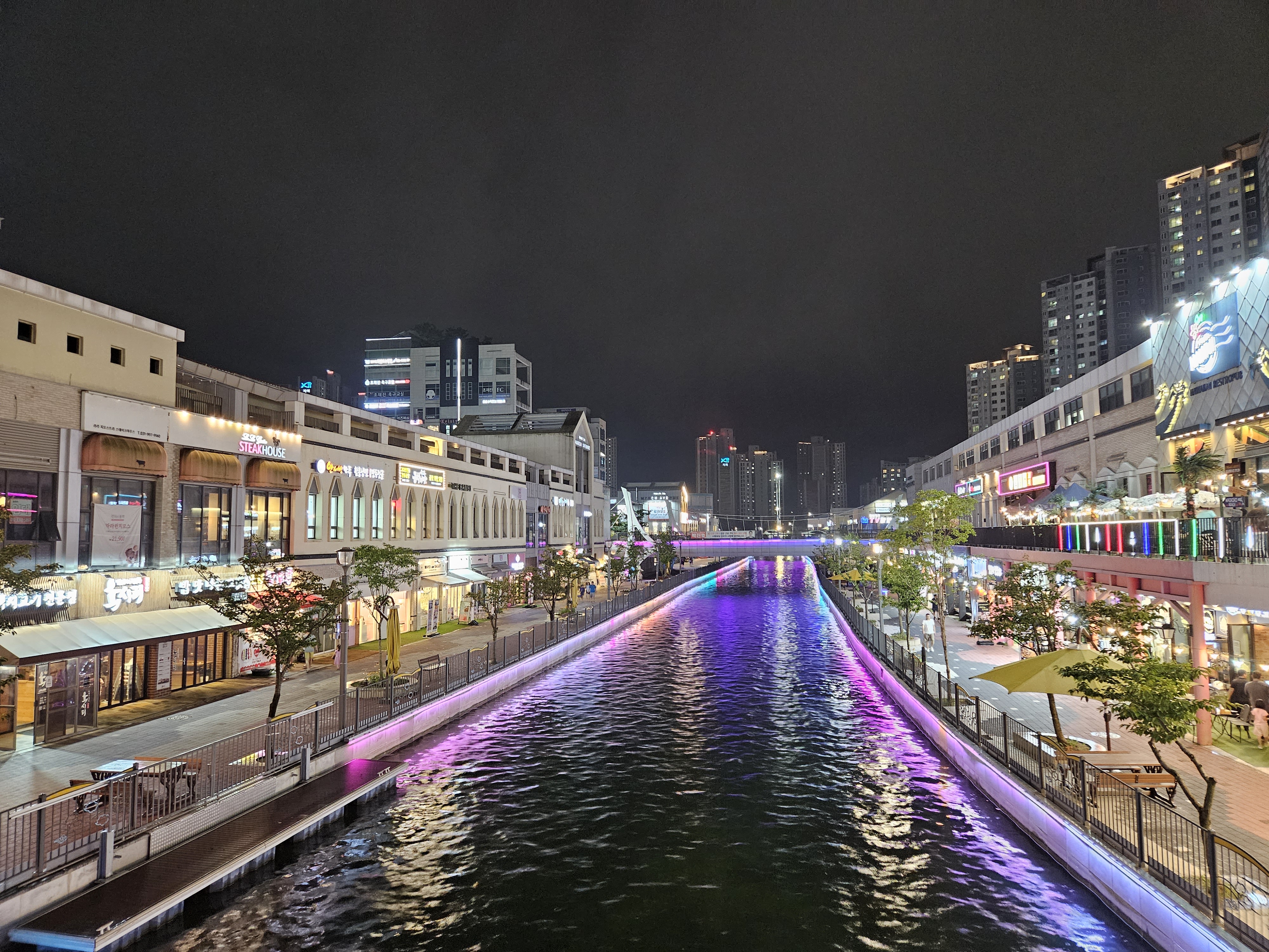 수변산책길인 금빛수로와 라베니체 상가가 어우러진 야경이 매우 이국적인 곳이죠.