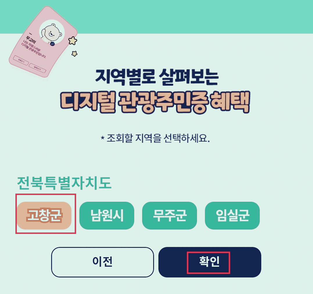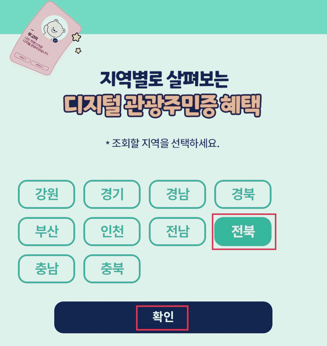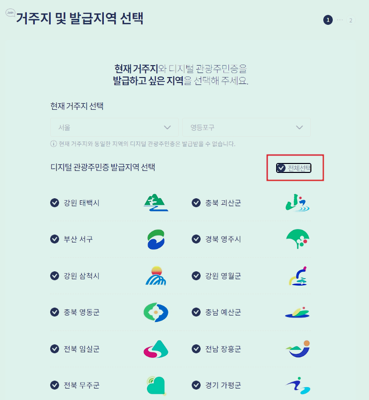 그리고 디지털 관광주민증을 발급받을 지자체를 선택하면 발급 완료됩니다.