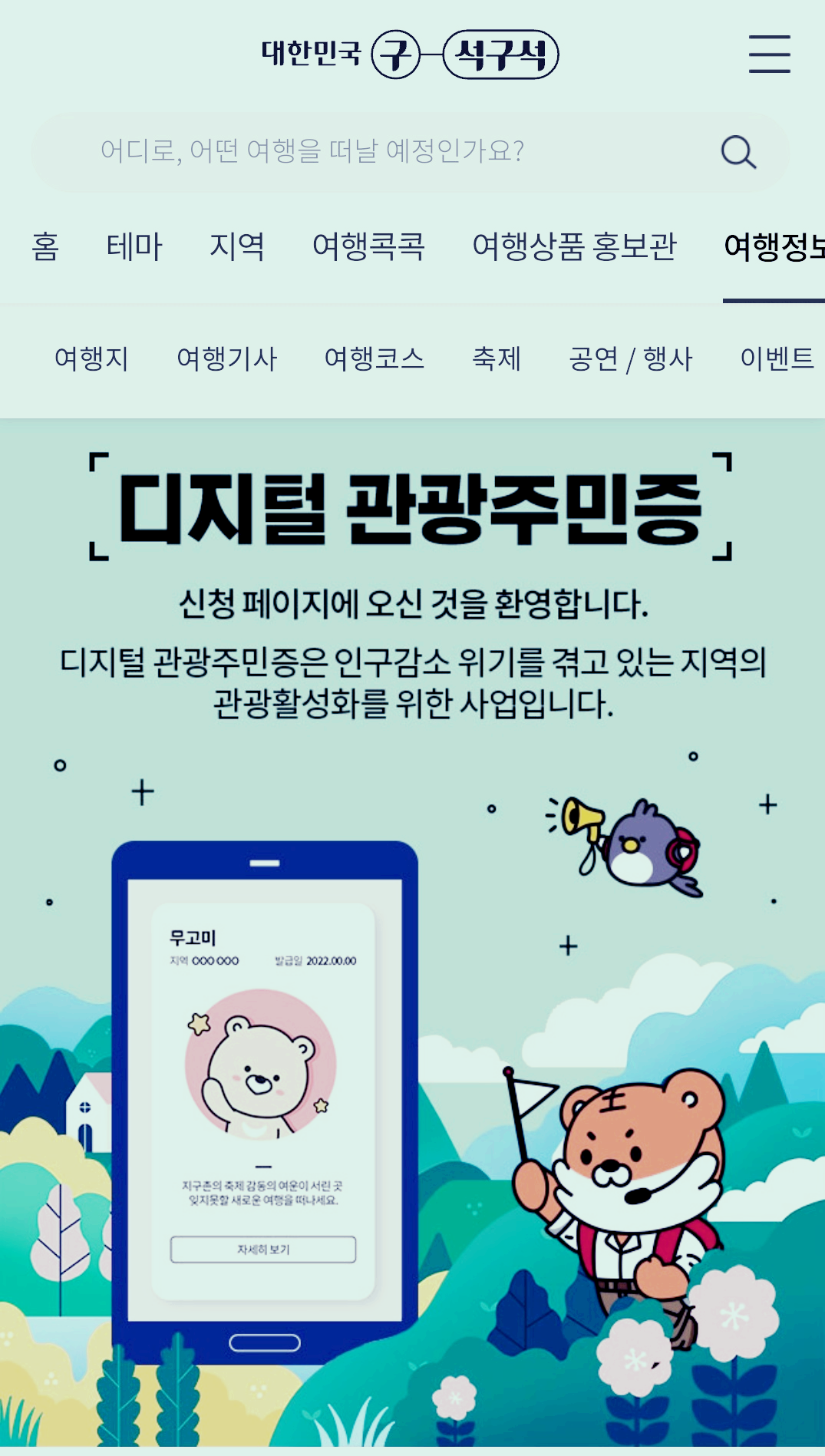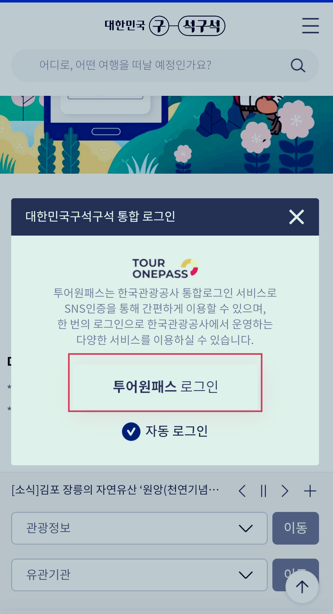 대한민국 구석구석은 한국관광공사에서 운영하며, 디지털 관광주민증을 발급받기 위해서 투어원패스로 로그인을 해야 합니다.