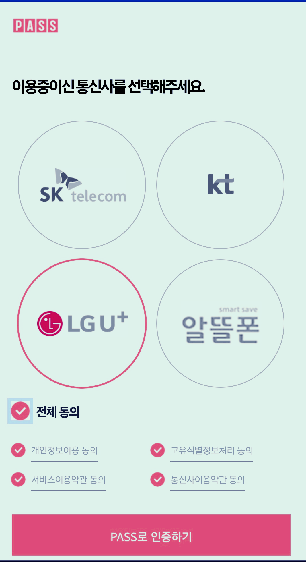 정보동의와 이동통신 인증을 차례대로 받으면 됩니다.