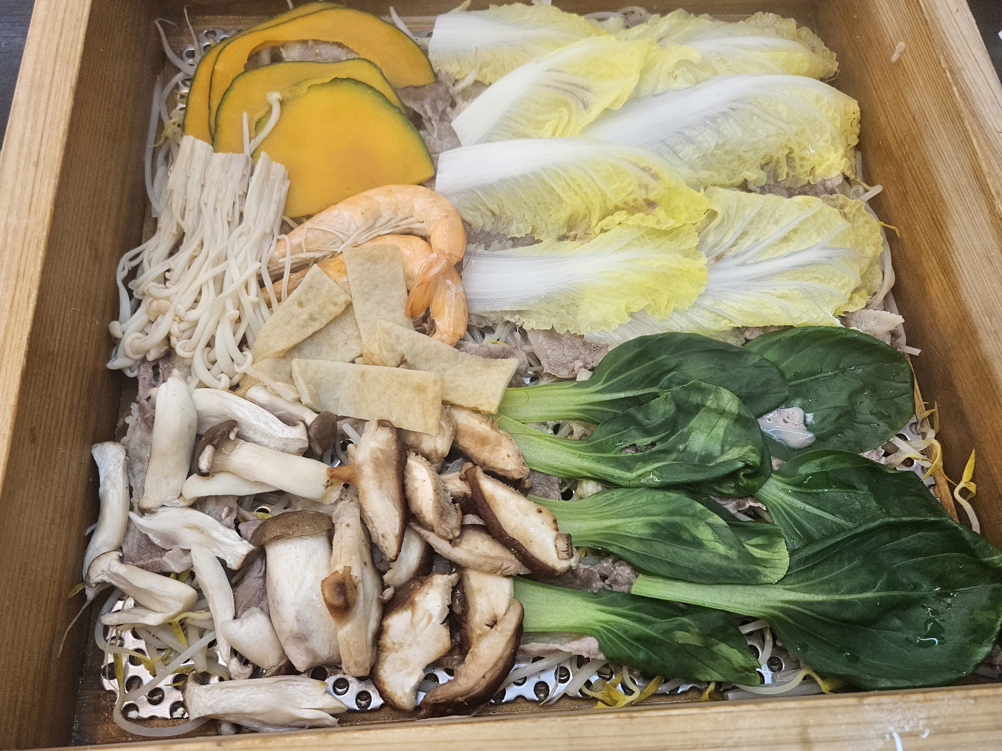 콩나물 위에 소고기, 버섯, 어묵, 새우, 채소 등 알차게 올라가 있습니다.